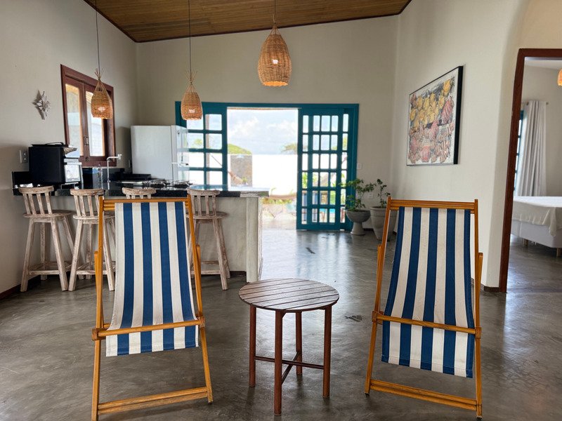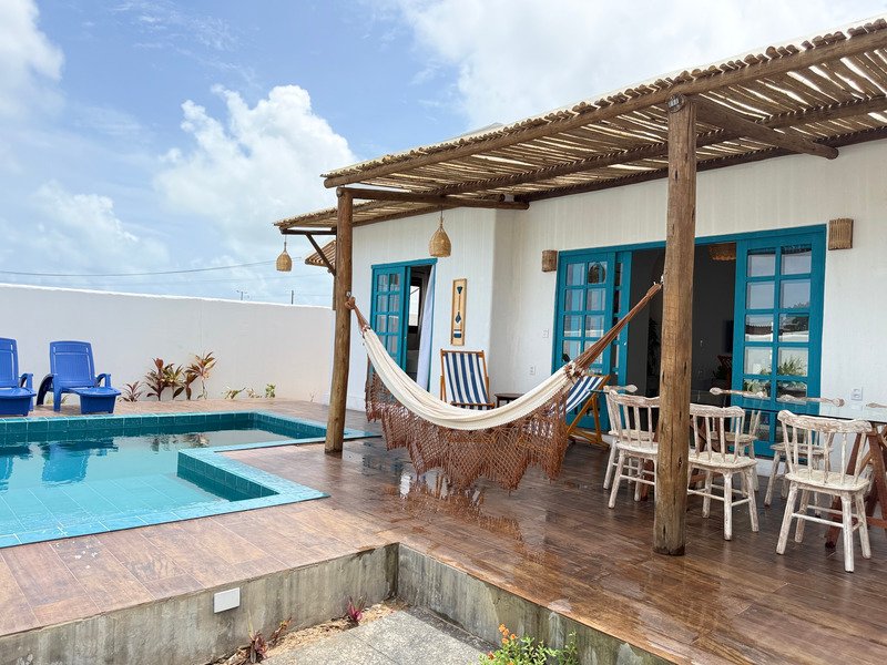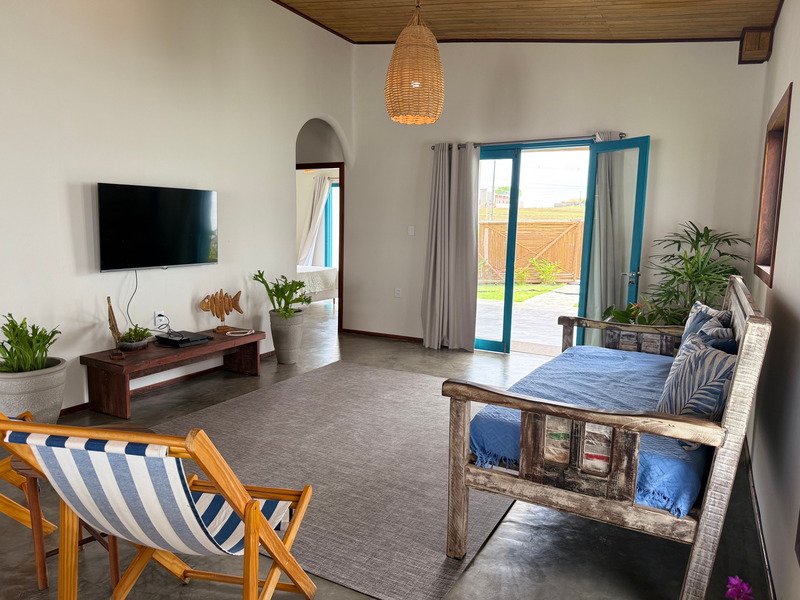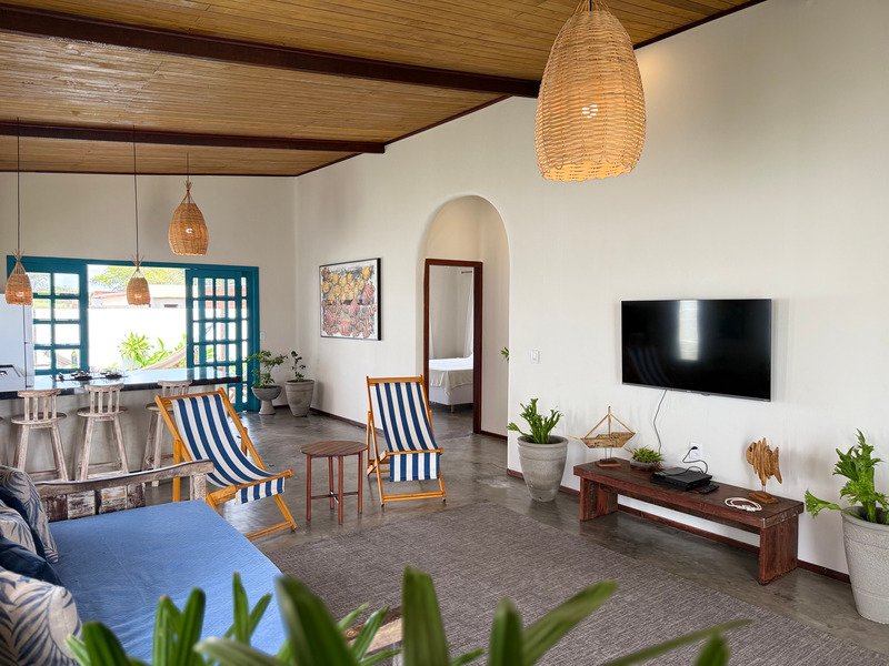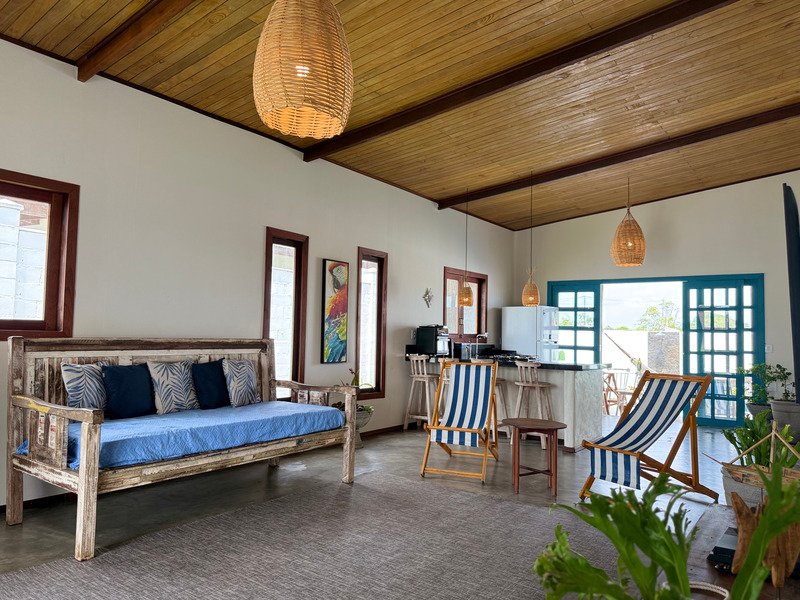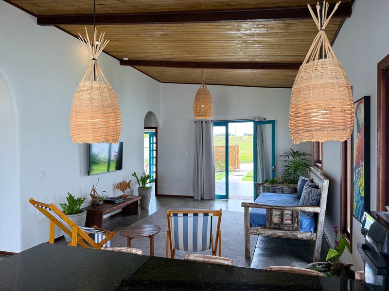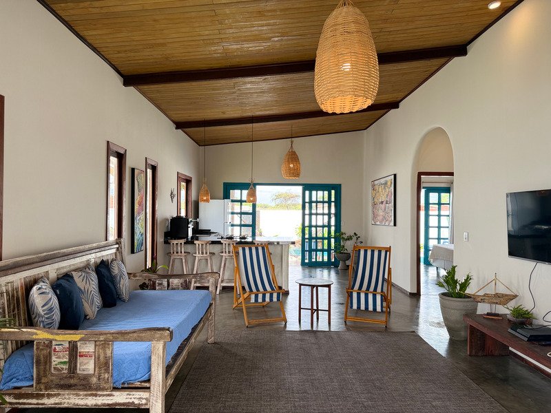 A sala ampla com cozinha integrada se conecta à varanda e ao pátio externo, onde a piscina privativa e a churrasqueira criam um ambiente perfeito para relaxar, receber amigos e aproveitar o clima de Pipa com tranquilidade.