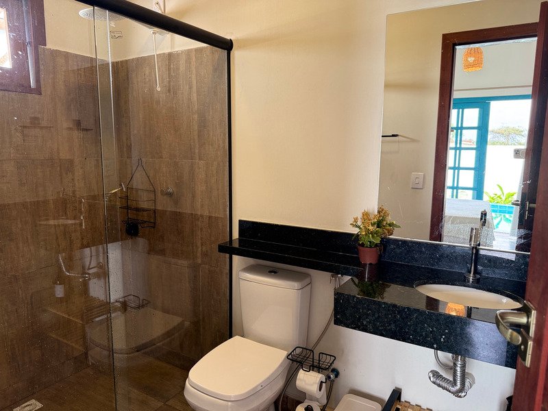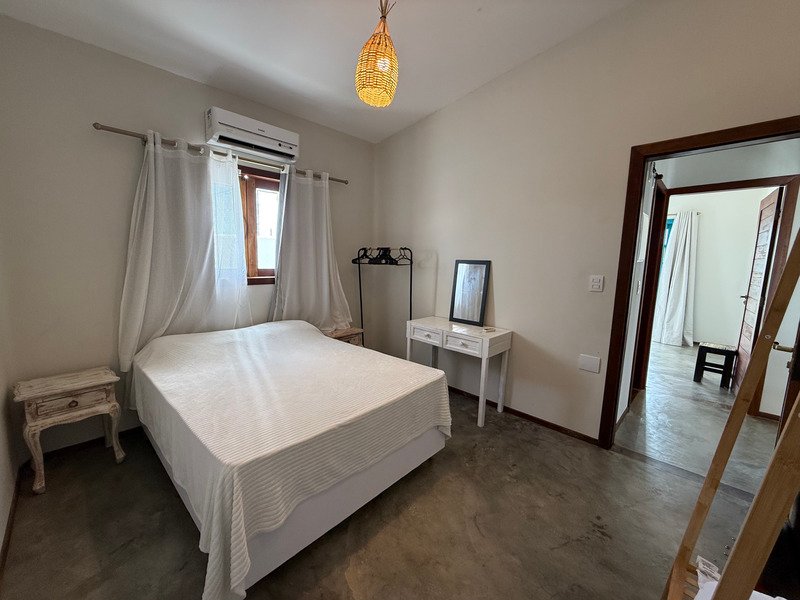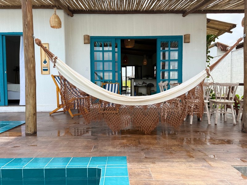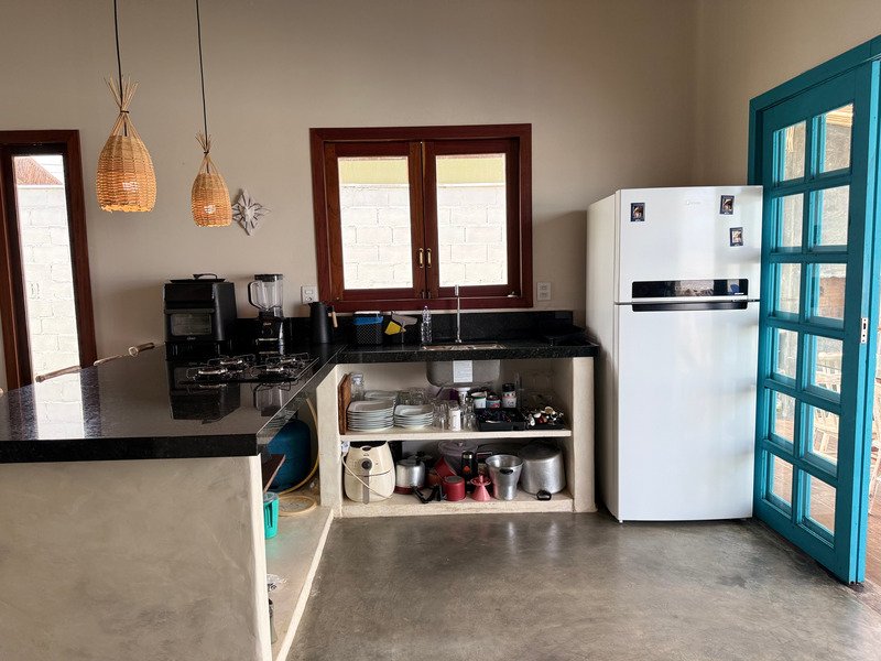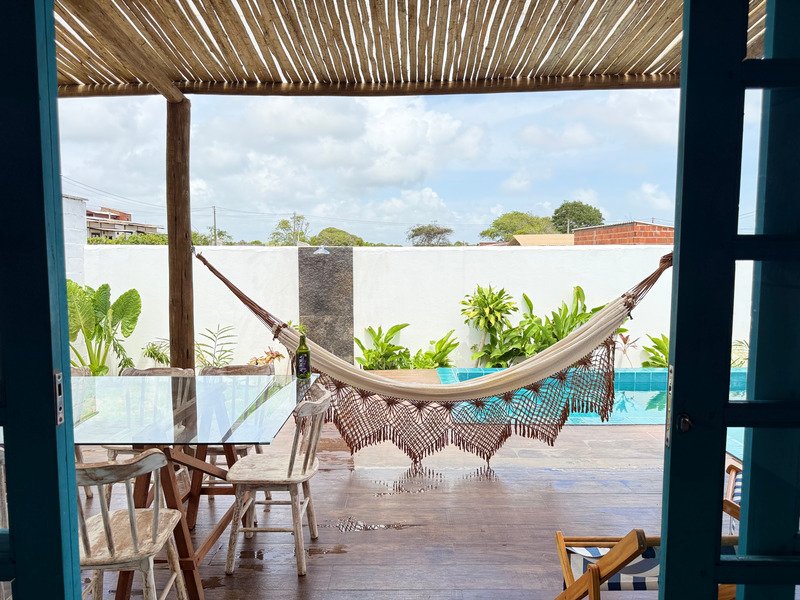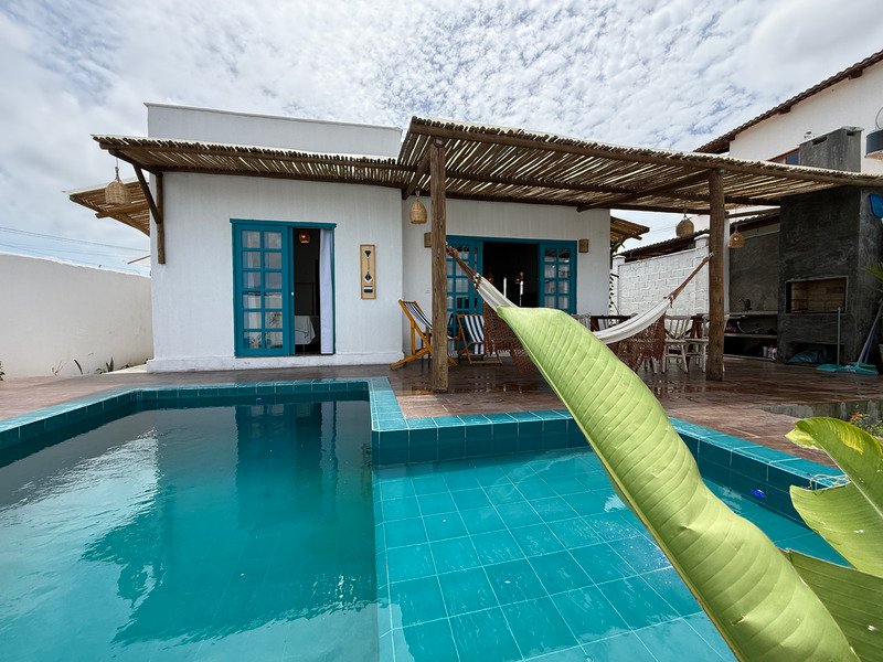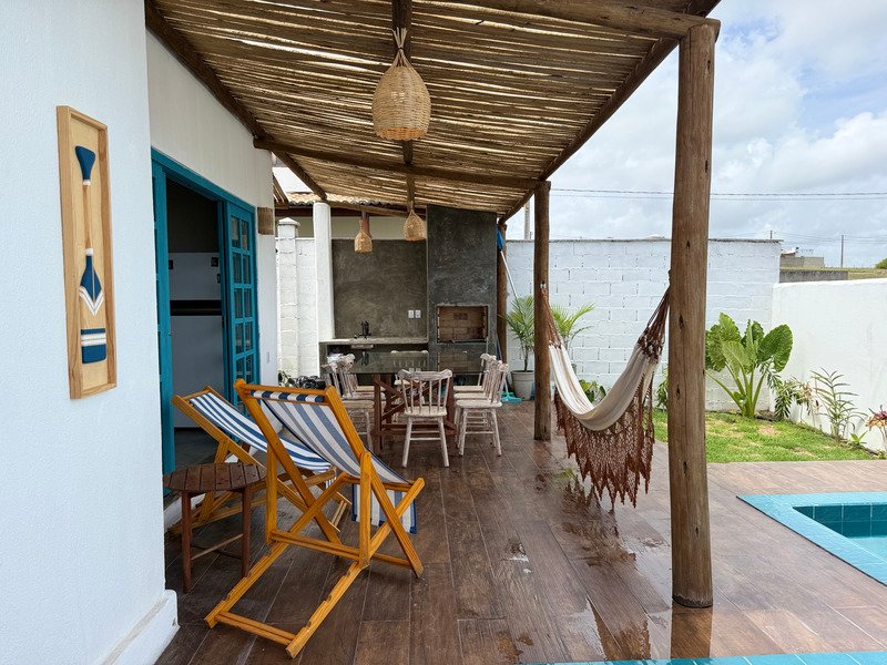 A sala ampla com cozinha integrada se conecta à varanda e ao pátio externo, onde a piscina privativa e a churrasqueira criam um ambiente perfeito para relaxar, receber amigos e aproveitar o clima de Pipa com tranquilidade.