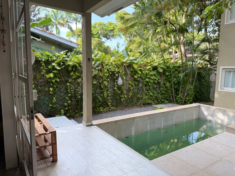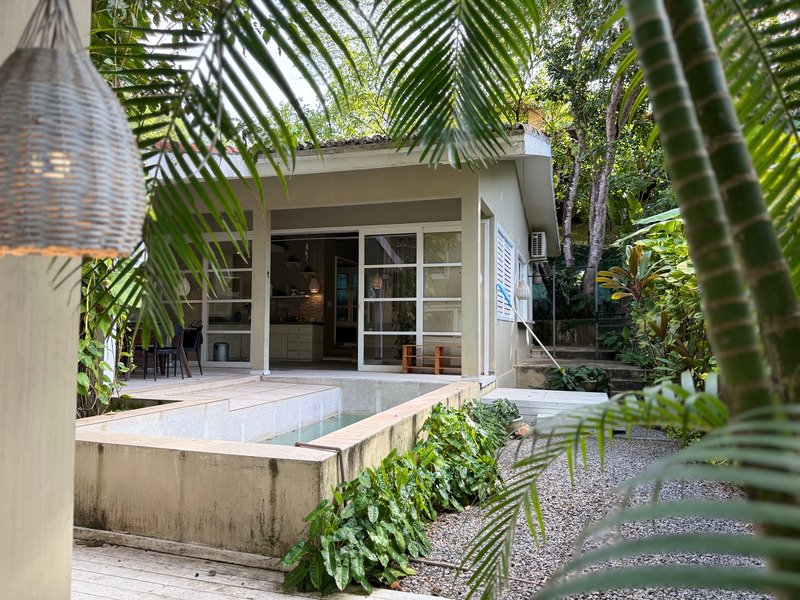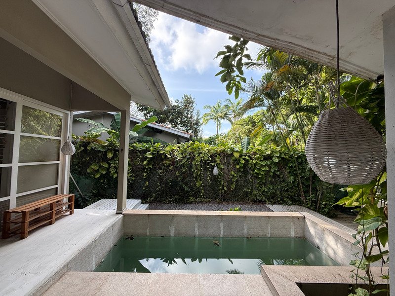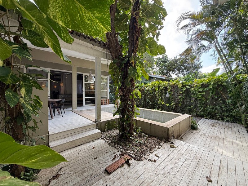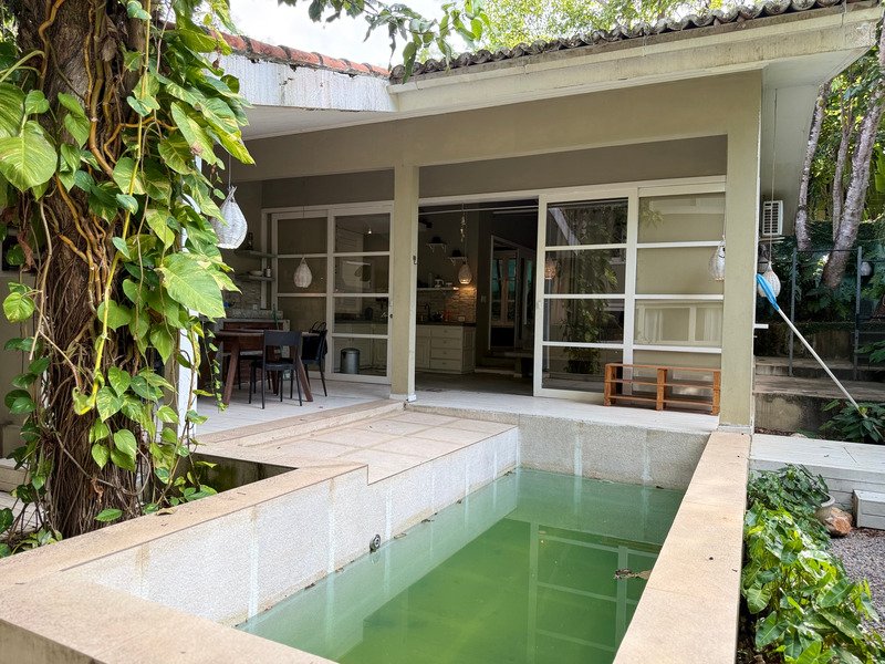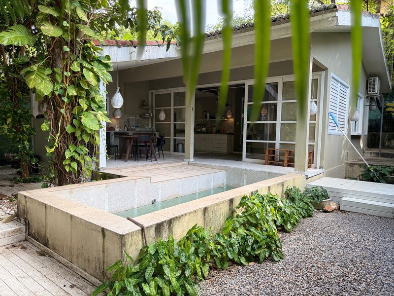 A área social possui sala e cozinha integradas, criando um ambiente prático e acolhedor, enquanto a área externa é um verdadeiro refúgio, com jardim bem cuidado, varanda, piscina privativa e jacuzzi.
