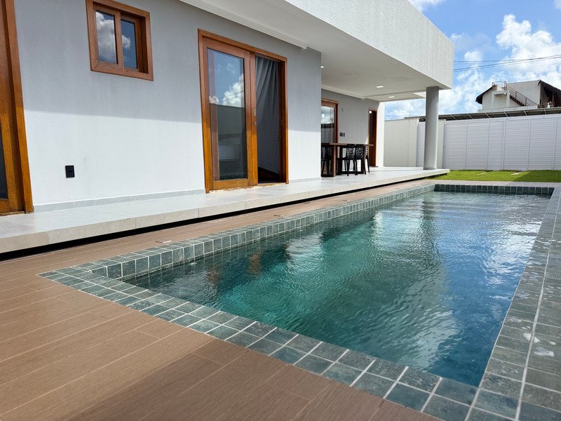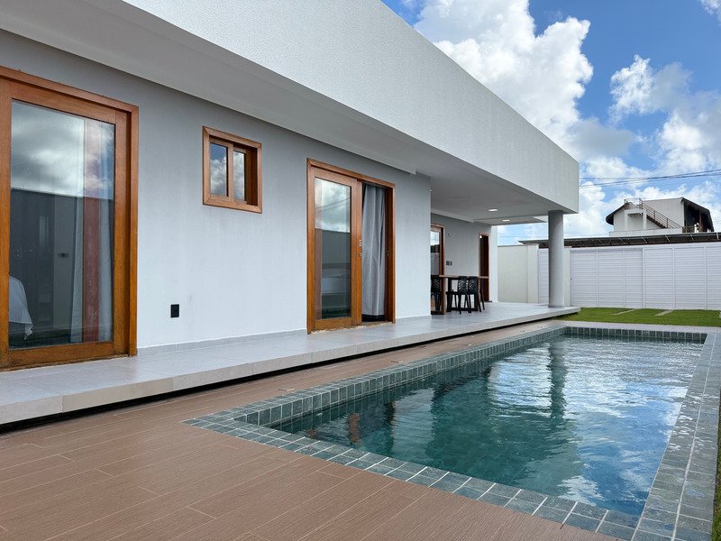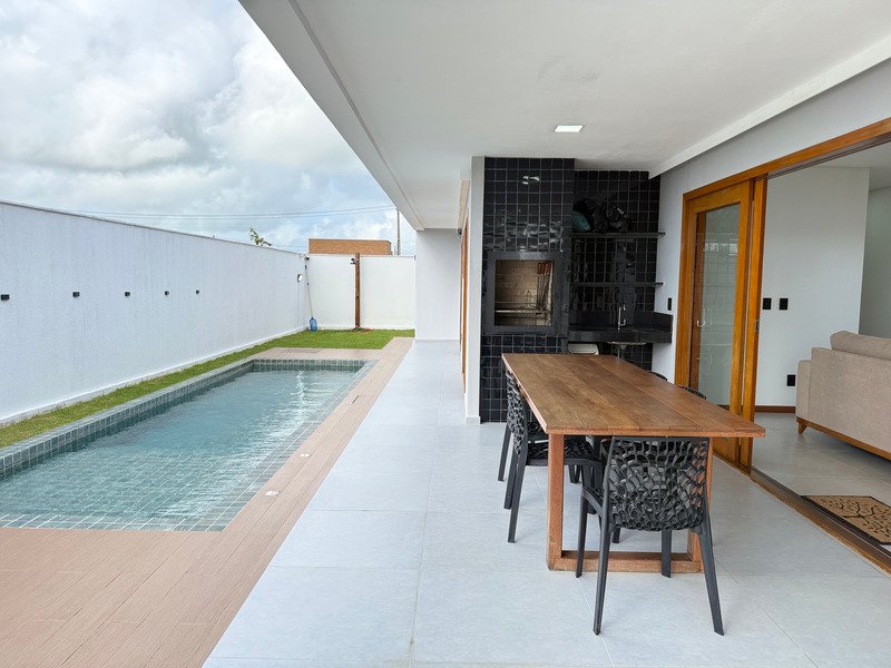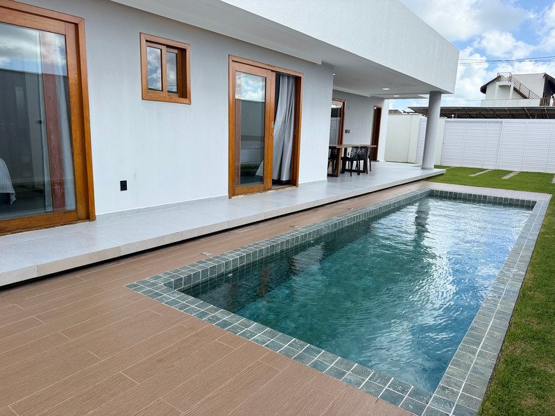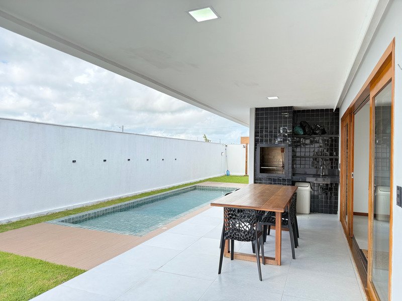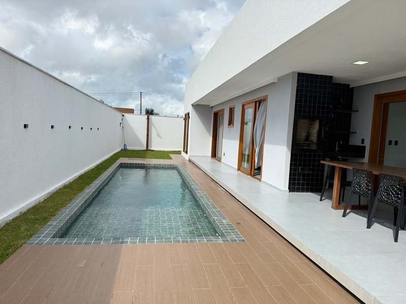 A área externa inclui deck e piscina, criando um ambiente agradável para aproveitar o clima e o estilo de vida do litoral.