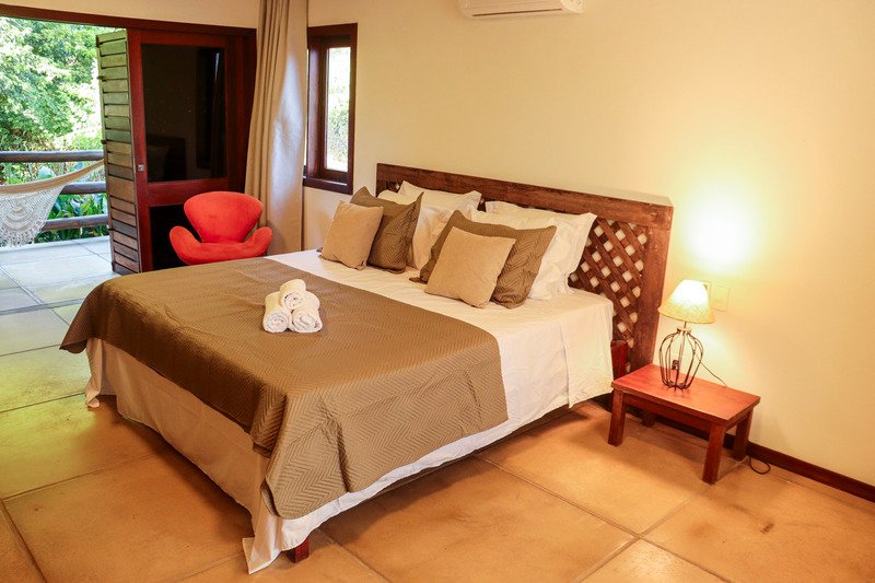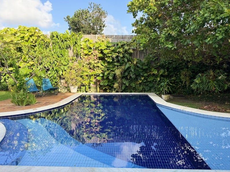 A área externa oferece uma piscina charmosa cercada por um jardim exuberante, tendo como vizinha de fundo a beleza preservada da Mata Atlântica.